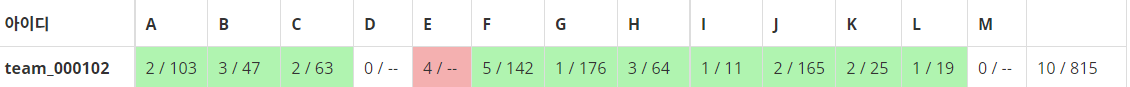 이후 내가 L 풀이를 구상해 짜서 맞았다. qjatn0120 선배는 구현량이 많은 A를 잡았으며, slah007 선배는 H를 잡았다.